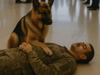 • À l’aéroport, des personnes ont remarqué un soldat allongé sur le sol froid, un berger allemand assis à côté de lui, aboyant sur les passants. La foule a été horrifiée en comprenant la raison de l’étrange comportement du chien.