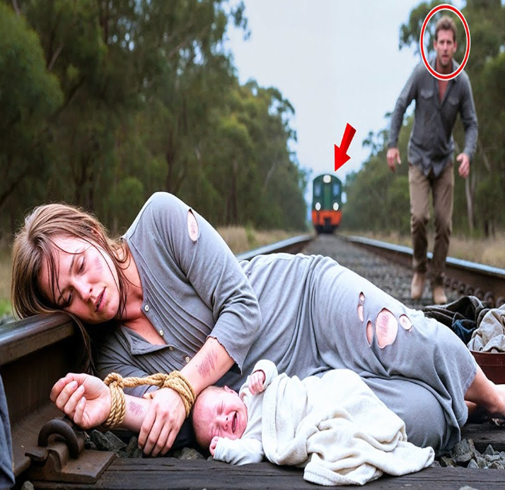 Charles repoussa ses limites, courant pour sauver sa vie, et soudain, une scène horrible le frappa, lui coupant presque le souffle. Deux silhouettes gisaient immobiles près des voies. C’était une jeune femme, décharnée, sa robe en lambeaux, ses cheveux noirs plaqués sur son visage creux. Ses mains étaient solidement attachées à une rampe, les cordes rugueuses entaillant profondément ses poignets pâles. Son autre jambe était également enchaînée à la rampe opposée. Plus horrible encore, sur sa poitrine, enveloppé dans un vieux morceau de tissu usé, se trouvait un nouveau-né, rouge et faible, avec seulement une petite touffe de cheveux noirs, qui pleurait, un cri si faible qu’il lui brisait le cœur.