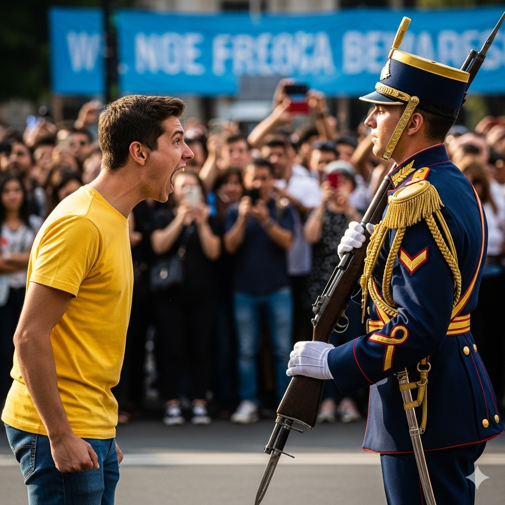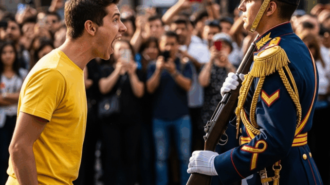 Un enfant gâté ridiculise une sentinelle grave — l’événement qui s’ensuit calme les spectateurs…