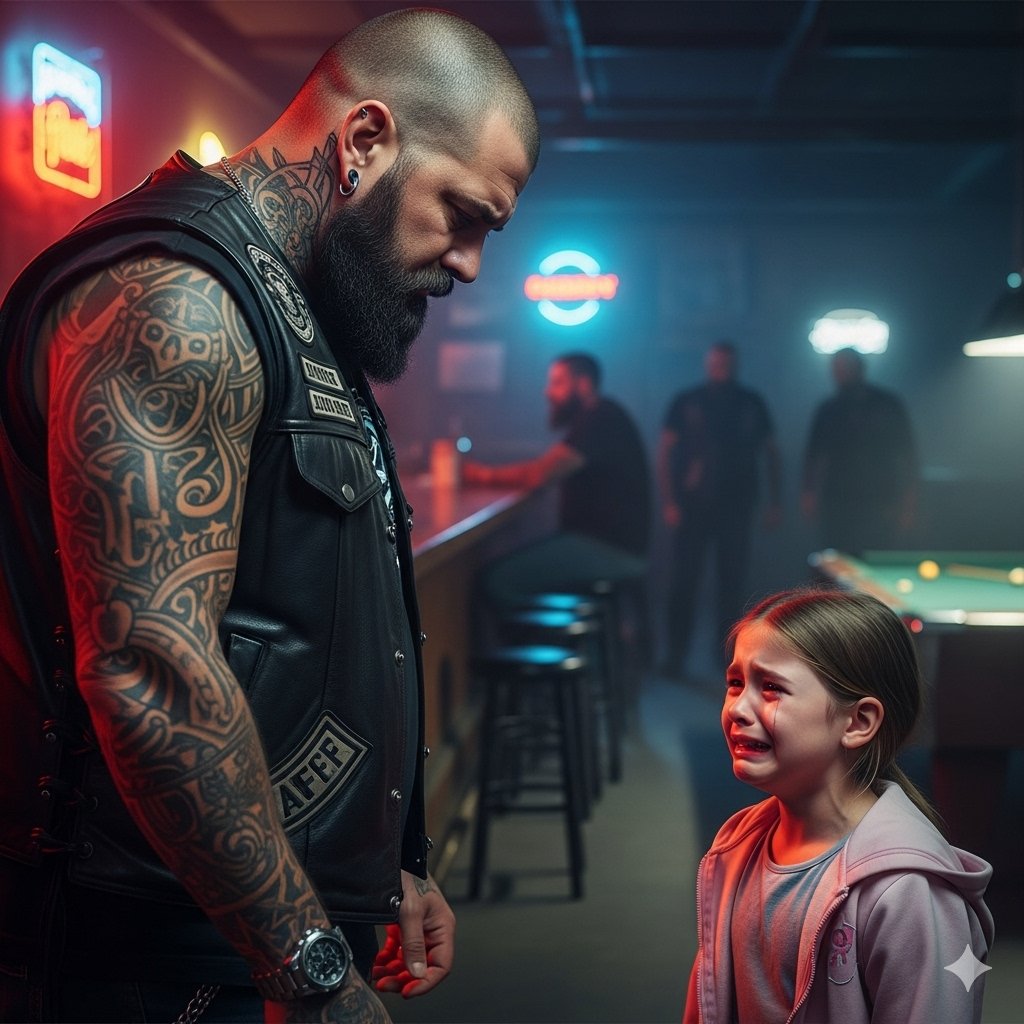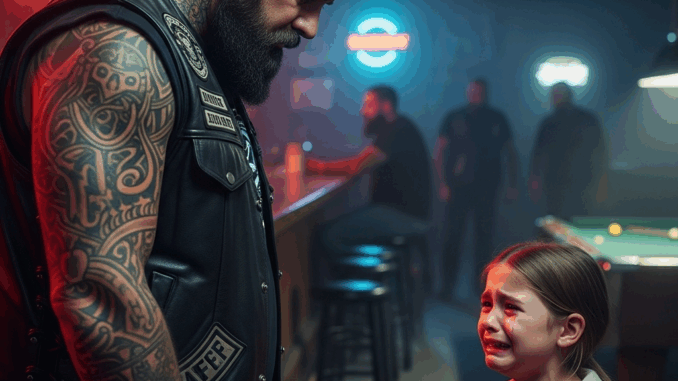 Tous les motards vêtus de cuir dans cette pièce enfumée se turent tandis que cette petite fille en pyjama, couverte de princesses Disney, se tenait dans l’embrasure de la porte, le visage ruisselant de larmes, fixant trente motards coriaces comme s’ils étaient son dernier espoir. Le jukebox semblait couvrir une chanson de Johnny Cash. Les queues de billard s’immobilisèrent en plein tour.