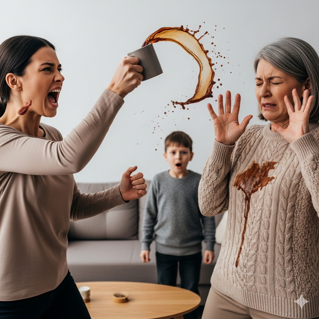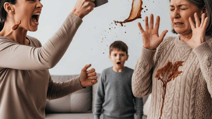 « Tu as renversé du café chaud sur elle ? » demanda-t-il, incrédule, les yeux écarquillés. « Sur grand-mère ? »
