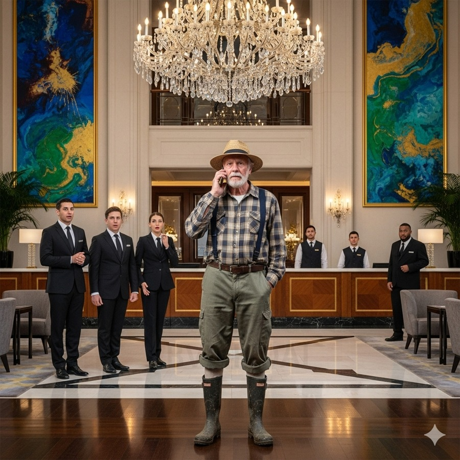 Certains visiteurs présents le regardaient avec un mélange d’inquiétude et de mépris. Tout le monde pense que ce fermier « veut grimper haut », ignore son identité, mais ose entrer dans un hôtel de luxe.
