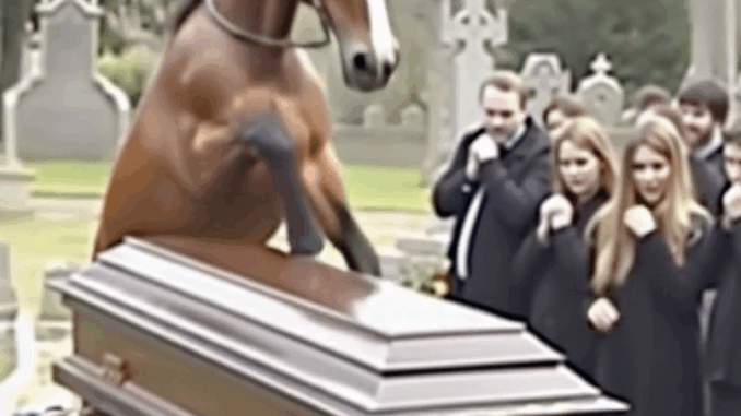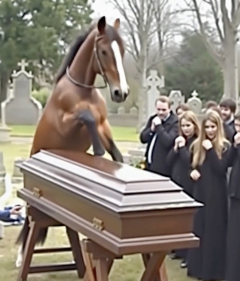 Elle était désormais une tempête en pleine furie, ses sabots frappant le sol avec un rythme qui résonnait dans les rues étroites et silencieuses. Sa crinière flottait comme un étendard, et ses yeux brillaient d’une lueur qui ressemblait presque à du défi. Alors qu’elle atteignait le cercueil, la foule s’écarta comme commandée par une main invisible. Rien ne pouvait la retenir ; c’était une force de la nature, invincible et résolue.