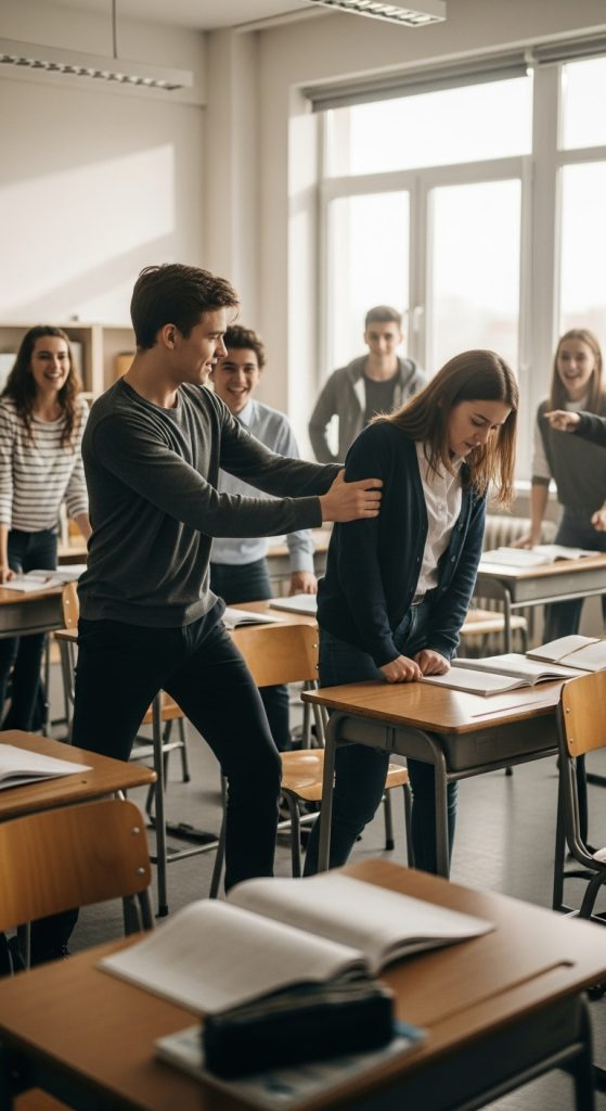 Tyler a commencé par des remarques sarcastiques — « Dis donc, la nouvelle, tu as encore perdu ta carte ? » — mais les taquineries sont vite devenues plus méchantes. Chaque jour, il trouvait de nouvelles façons de l’embarrasser devant les autres : la faire trébucher dans le couloir, lui arracher ses cahiers, imiter sa voix. Les autres élèves riaient nerveusement, n’osant pas intervenir.