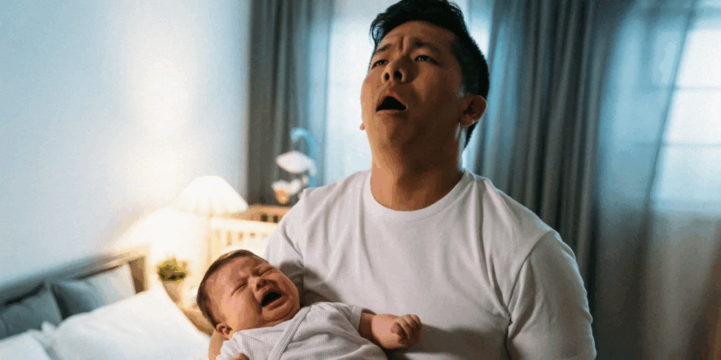 James a l’air fatigué en tenant Lily | Source : Midjourney