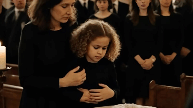 Près du cercueil se tenait la mère, tenant la main de sa petite fille. La fillette restait silencieuse, ses cheveux bouclés lui cachant le visage. Depuis le drame, elle avait à peine parlé, et tous pensaient qu’elle ne comprenait pas ce qui s’était passé.
