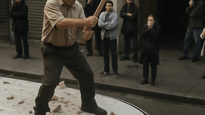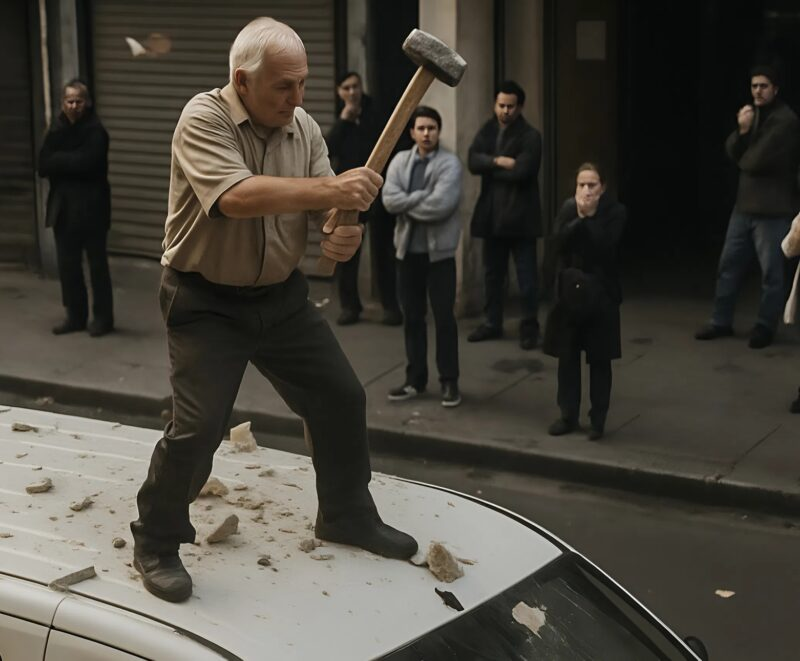 Dans une rue étroite du vieux quartier, un bruit sec et sourd retentit soudain, comme si quelqu’un avait frappé une épaisse plaque de métal avec une force incroyable. Les passants sursautèrent et se retournèrent. La source du bruit était évidente : sur le toit d’une camionnette blanche se tenait un homme âgé aux cheveux gris, tenant un lourd marteau de chantier à deux mains.
