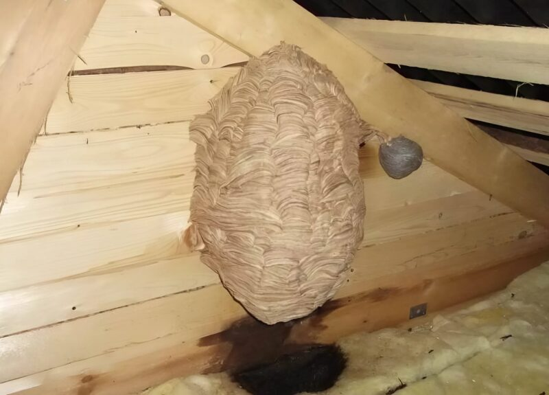 Aujourd’hui, c’est arrivé de nouveau. Mais cette fois, le bruit était plus persistant, plus fort… et plus proche. J’ai pris une lampe torche et je suis monté lentement. Le grenier était étouffant, avec une odeur étrange, douceâtre et désagréable. Soudain, je l’ai vu : au plafond, près du mur, pendait une énorme excroissance gris-jaune, comme faite de papier, avec d’étranges couches circulaires. C’était précisément de là que provenaient les bruits.
