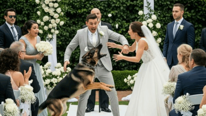 Surgissant de derrière l’arche fleurie, Max, son fidèle berger allemand et ancien chien policier en formation, bondit en avant avec un grognement féroce. Son poil se hérissa, ses dents furent découvertes, et ses yeux fixèrent Mark. Avant que quiconque puisse réagir, Max se jeta sur Mark et lui planta ses crocs dans la jambe.