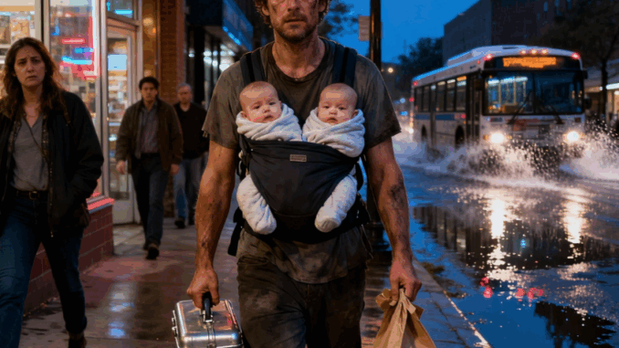 C’était juste un père fatigué, rentrant chez lui avec une boîte à outils dans une main, des courses dans l’autre, et deux nourrissons attachés à sa poitrine après que leur mère les eut abandonnés.