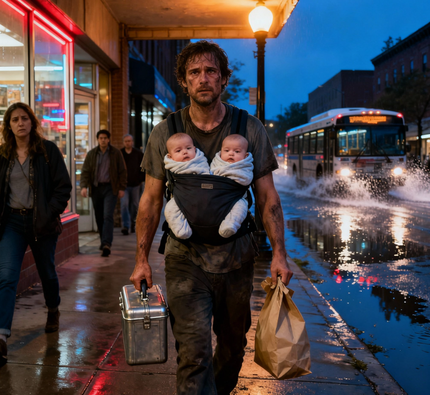 Les lumières de la ville scintillaient sur un ciel de novembre marqué par les intempéries tandis que Daniel Brooks avançait péniblement sur le trottoir fissuré, une main agrippée à une boîte à outils cabossée, l’autre à un fin sac en plastique. Ses jumeaux, Matthew et Michael, âgés de six mois, dormaient paisiblement, leurs petites têtes pressées contre sa veste de travail délavée.