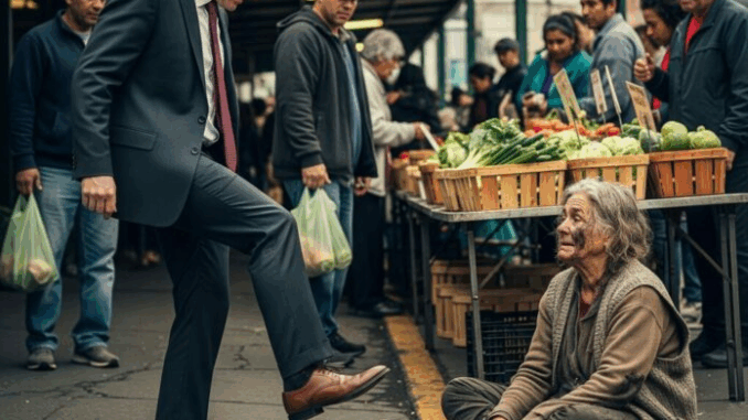 Une femme en haillons était assise, le dos courbé, contre un lampadaire. Ses cheveux étaient grisonnants, son manteau fin et effiloché, et sa main tremblait lorsqu’elle tendit la main.