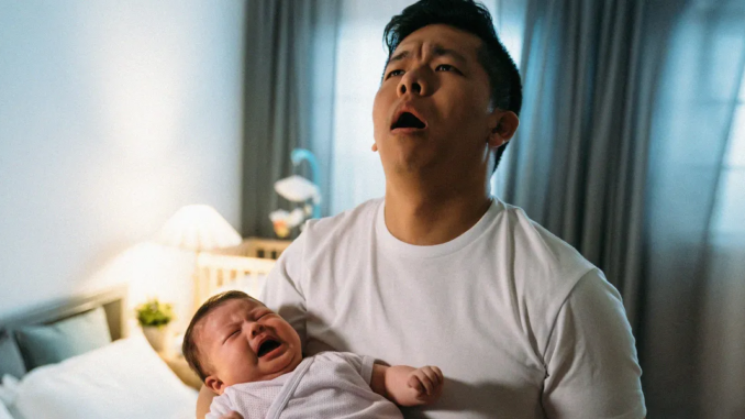James, l’air fatigué, tient Lily dans ses bras | Source : Midjourney