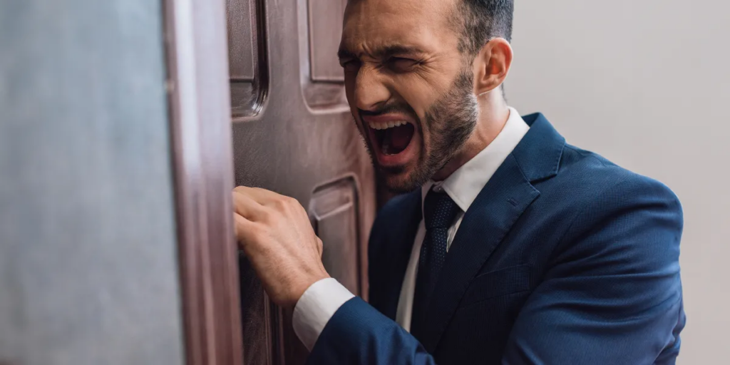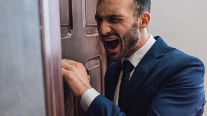 Un homme en colère se tient sur le perron de sa maison | Source : Midjourney