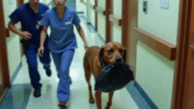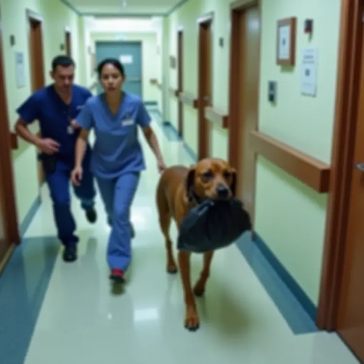 Le chien se dirigea d’un pas assuré vers l’hôpital local, un petit établissement vital pour la santé de la communauté. Alors que Max approchait de l’entrée, il marqua une pause, comme s’il réfléchissait à sa prochaine action. Avec une agilité surprenante, il poussa les portes battantes et entra à pas feutrés, le sac noir traînant derrière lui dans un léger bruissement.